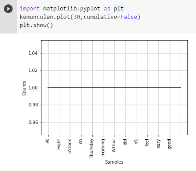 Silahkan klik gambar untuk lebih besar dan jelas. pada gambar di atas adalah hasil dari FreqDist atau pencarian probabilitas kemunculan kata. Dan hasilnya semua kata keluar nya 1 atau tidak ada duplikasi di setiap kata yang keluar.